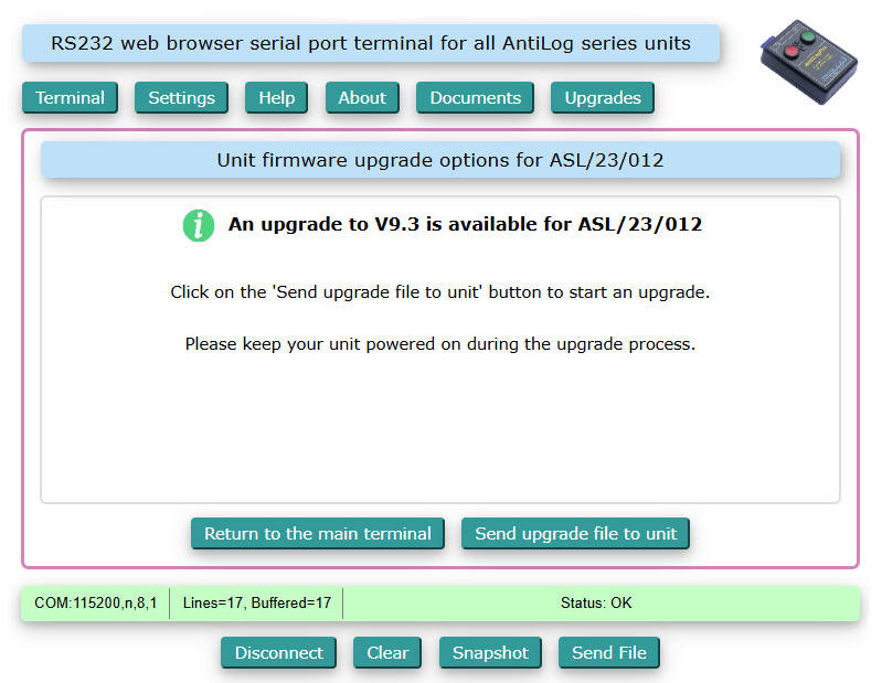 - The main menu in the AntiLog and AntiLogPro V9.0 firmware now has an additional header line. This version of AntiTermPro software can recognise this revised main menu format in the uploads and upgrades side menu options.